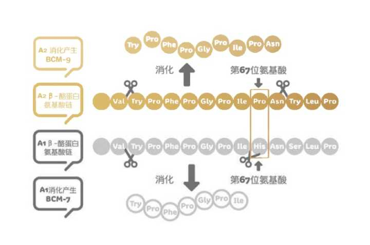 蛋白質可以理解為用氨基酸連接起來的鏈條,A2β酪蛋白和A1β酪蛋白的唯一區別就是在於第67位的氨基酸不同。