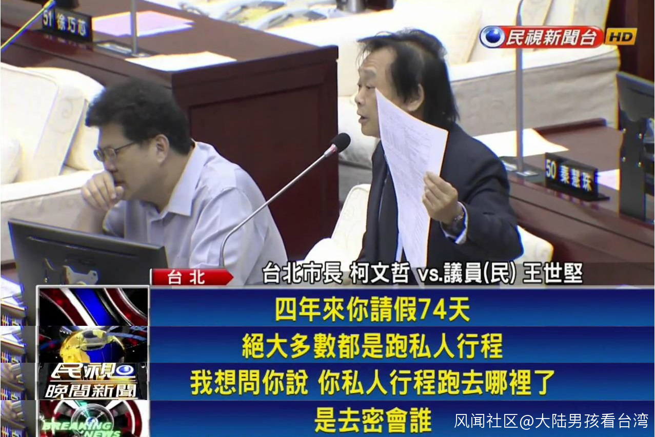 據台灣媒體報道,在今天下午的市政總質詢上,王世堅拿出一份表格稱,柯文哲就任台北市長四年來一共請假74天。他質問,請假的私人行程都跑去哪了?去密會了誰?沒有想到的是,柯文哲竟然回,“我沒有去汽車旅館”。