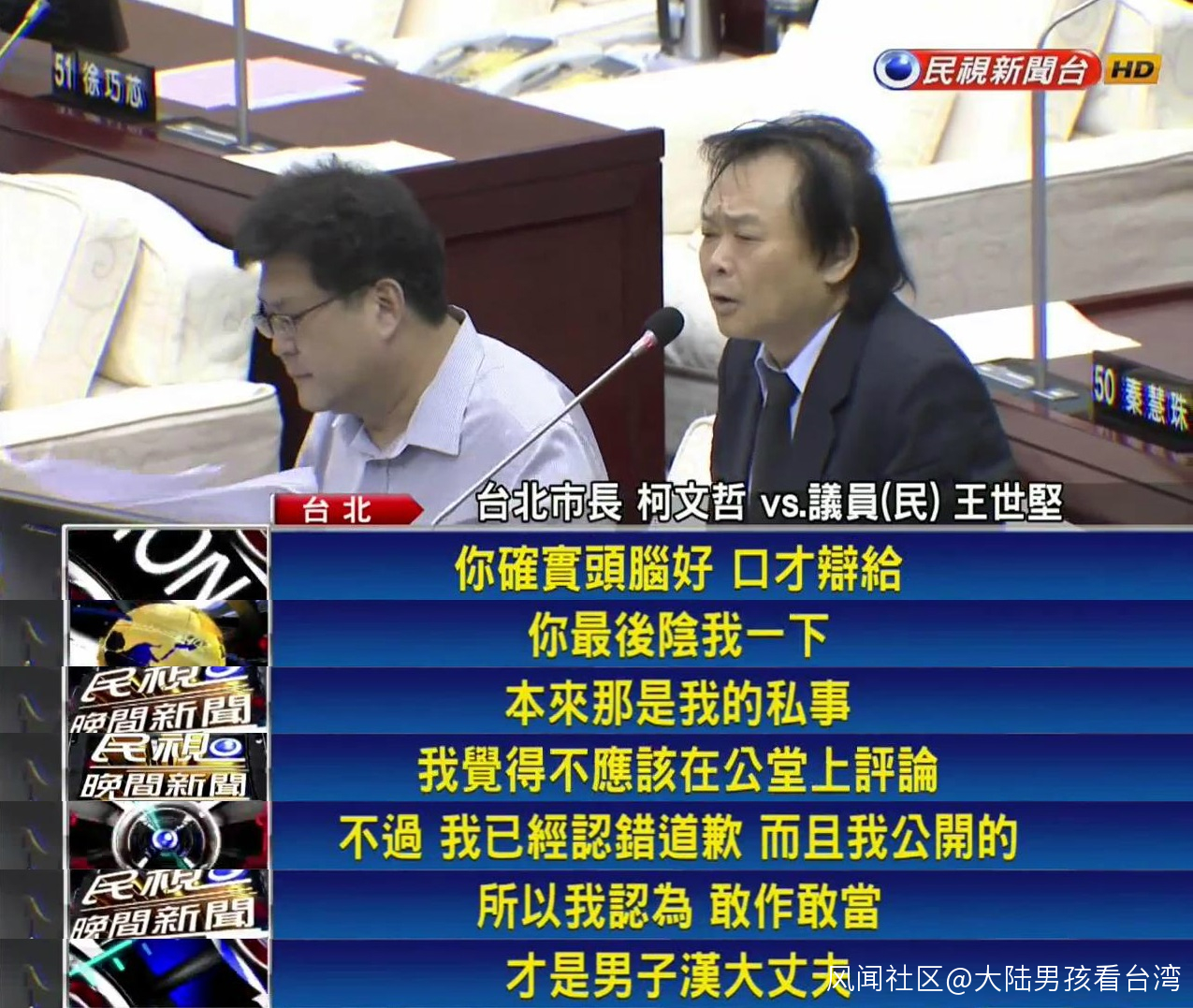 柯文哲的急智不僅是讓全場爆笑,也讓王世堅一時語塞,後者只能訕訕地説:“我想你也不敢啦,你沒有膽識啦!”