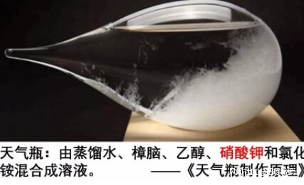 其次,我們學化學的男生,都非常勇敢。曾經我有一個師弟為了追女孩子,熬夜為她趕製了一個天氣瓶,就是那種瓶內結晶會隨着温度而變化的好看玻璃瓶。但是,天氣瓶的製作是需要硝酸鉀的…