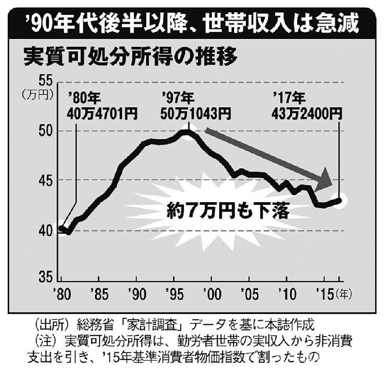 日本泡沫經濟破滅以來,大部分國民的收入低迷。20世紀90年代後期,許多妻子為維持家庭生計開始工作。雙職家庭數量不斷增加,但每户家庭每月可支配收入卻在1997年達到頂峯之後,下跌了約7萬日元(約為4500人民幣)。