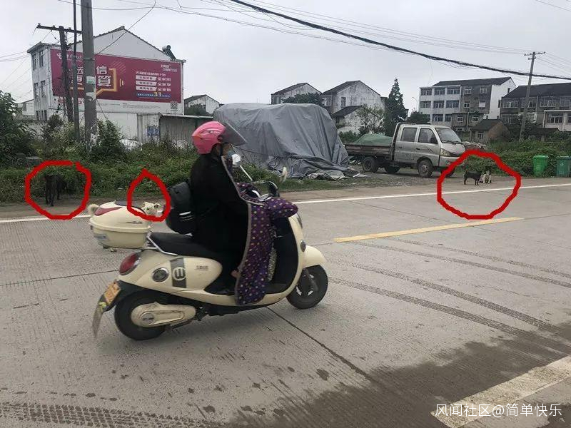 女子騎車經過,邊上就有四隻狗。(紅圈內)