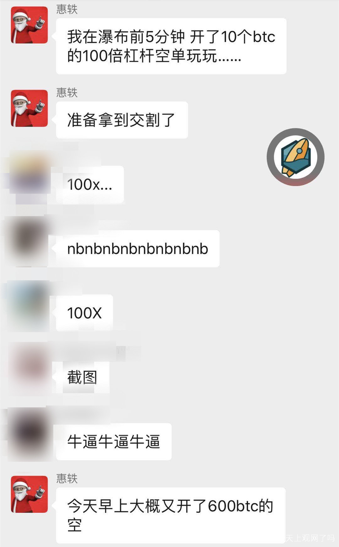 有消息稱,2018年比特易曾推出過數款比特幣合約產品,此次惠軼被爆倉的BTC資金是源自客户的。一張網上流傳的與比特易相關的500人投資羣聊天記錄顯示,5月31日,惠軼在羣中自稱“開了10個比特幣100倍槓桿空單”“又開了600比特幣的空”。然而,2019年4月份以來,比特幣的行情已經走出了多根大陽線,30天內的最高漲幅超過30%,僅在5月17日和5月31日出現了兩次斷崖式下跌的行情。其中,5月17日比特幣在1個小時內出現了由近7800美元狂瀉至不到7200美元,最大跌幅超20%;5月31日,比特幣24小時內的最高價格為9008.31美元,最低價8221.27美元,最大跌幅未超過10%。此後,比特幣又出現了一波反彈行情。