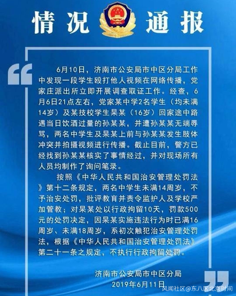 6月11日,濟南市公安局市中區分局通報,對兩名未滿14週歲的學生批評教育並責令監護人及學校嚴加管教。另一學生16歲,處以行政拘留10天,罰款500元的處罰。因其未滿18歲,初次觸犯治安管理處罰法,不執行行政拘留處罰。