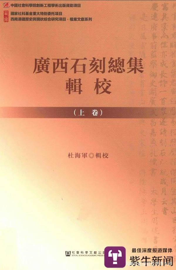 該項研究成果的著作《廣西石刻總集輯校》(簡稱《輯校》)主要是對廣西各地的石刻進行編輯和校對,由廣西師範大學文學院教授、博士生導師杜海軍主持,全書180萬字。據中國社會科學網資料顯示,《輯校》由社會科學文獻出版社於2014年12月出版,出版後社會反響良好。
