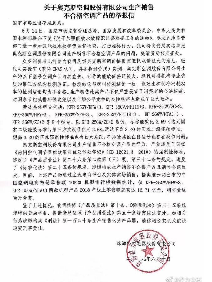 相比較格力方面有理有據的公開舉報,奧克斯方面的回應則顯得有些蒼白無力。