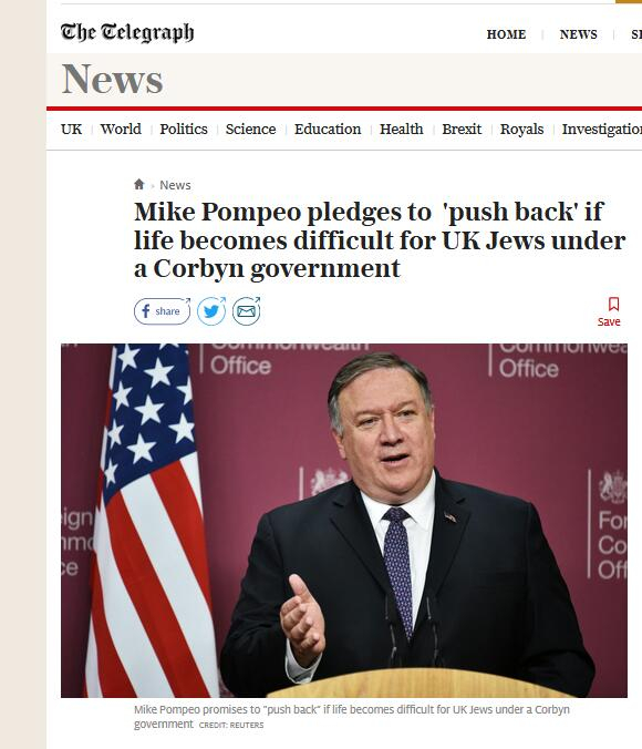 《每日電訊報》説,蓬佩奧是在與美國猶太領袖舉行閉門會議時發表這番言論的,當時的一段錄音這兩天被泄露給了《華盛頓郵報》。“今日俄羅斯”(RT)稱,蓬佩奧顯然是在回應針對科爾賓的“反猶太主義”指控。