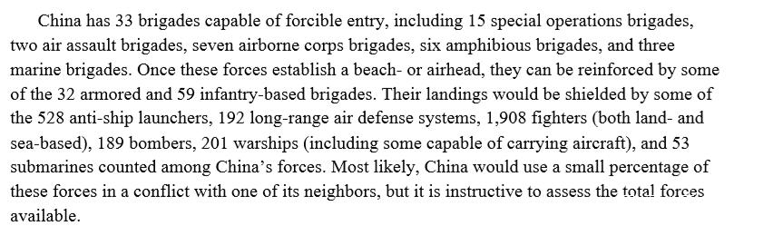 解放軍現有33個旅能夠實施強行登陸,一旦這些部隊奪取一個灘頭或者機場,隨後就會有32個裝甲旅和59個步兵旅可以投入作戰——中國可以動用528輛反艦導彈發射車、192套遠程防空系統,1908架戰鬥機、189架轟炸機、201艘戰艦和53艘潛艇提供支援。中國每次對付一個對手可能只會動用上述部隊的一小部分,但我們不得不正視其強大的總兵力