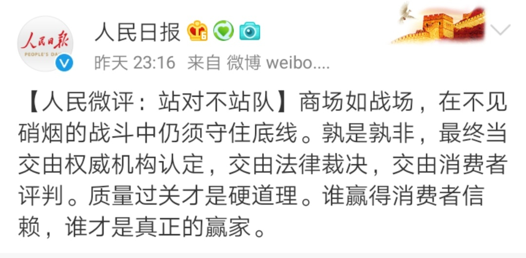 目前,國家市場監督管理總局和中消協都已經對此事進行關注,浙江省市場監督管理局已經介入調查。而人民日報官方微博也在昨晚發表短評《站對不站隊》:商場如戰場,在不見硝煙的戰鬥中仍須守住底線。孰是孰非,最終當交由權威機構認定,交由法律裁決,交由消費者評判。質量過關才是硬道理。誰贏得消費者信賴,誰才是真正的贏家。