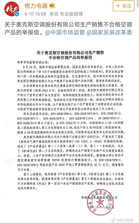 6月10日,格力電器用官方發微博舉報稱,經(格力電器)實驗室和第三方機構檢測驗證,奧克斯生產的部分型號空調與實際宣傳、標稱的能效值差距較大,能效比和製冷消耗功率檢測結論均為不合格,侵害消費者權益,甚至列出了奧克斯虛標能效產品具體型號,包括KFR-25GW/NFW+3 KFR-35GW/NFI19+3 KFR-25GW/ZC+2 KFR-35GW/HFY+3 KFR-35GW/NFW+3 KFR-25GW/NFI19+3 KF-26GW/NFA1+3 KFR-35GW/ZC+2等8個型號。