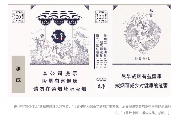 **參考資料:**1. 寬窄-都江堰煙包設計,潘佳佳兒,https://www.zcool.com.cn/work/ZMjEyNTI5MzY=.html2. Tobacco rules,Global Times, http://www.globaltimes.cn/content/690842.shtml3. Hiilamo, H., Crosbie, E., & Glantz, S. A. (2014). The evolution of health warning labels on cigarette packs: the role of precedents, and tobacco industry strategies to block diffusion. Tobacco control, 23(1),e2-e2.4. Cigarette Package Health Warnings: International Status Report 2018,Canadian Cancer Society, https://www.fctc.org/wp-content/uploads/2018/10/CCS-international-warnings-report-2018-English-2-MB.pdf5. Environics Research Group. The Health Effects of Tobacco and Health Warning Messages on Cigarette Packages—Survey of Adults and Adults Smokers:Wave 12 Surveys. Prepared for Health Canada. Toronto, Canada: Environics Research Group, 2007.6. Shanahan P, Elliott D. Evaluation of the Effectiveness of the Graphic Health Warnings on Tobacco Product Packaging 2008. Canberra: Australian Government Department of Health and Ageing, 2009. http://www.health.gov.au/internet/main/publishing.nsf/Content/health-pubhlth-strateg-drugs-tobacco-warnings.htm7. Hammond, David. “Health warning messages on tobacco products: a review.” Tobacco control 20,no. 5 (2011): 327-337.8. Hammond D, Fong GT, McDonald P, et al. Impact of the graphic Canadian warning labels on adult smoking behaviour. Tob Control 2003;12:391–5.9. International Tobacco Control Policy Evaluation Project. FCTC Article11–Tobacco Warning Labels: Evidence and Recommendations from the ITCProject. 2009.10. Liefeld JP. The Relative Importance of the Size, Content and Pictures on Cigarette Package Warning Messages. Prepared for Health Canada.Guelph, Canada: Department of Consumer Studies, University of Guelph, 1999.11. Borland R, Wilson N, Fong GT, et al. Impact of graphic and text warnings on cigarette packs: findings from four countries over five years. TobControl 2009;18:358–64.12. Fischer PM, Richards EJB, Krugman DM. Recall and eye tracking study of adolescents viewing tobacco advertisements. JAMA 1989;261:84–9.13. Willemsen MC, Simons C, Zeeman G. Impact of the new EU health warnings on the Dutch quit line. Tob Control 2002;11:382.14. UK Department of Health. Consultation on the Introduction of Picture Warnings on Tobacco Pack, 2006. http://www.dh.gov.uk/assetRoot/04/13/54/96/04135496.pdf15. 控煙與中國未來,http://www.notc.org.cn/chbsh/201303/P020130329747193348212.pdf