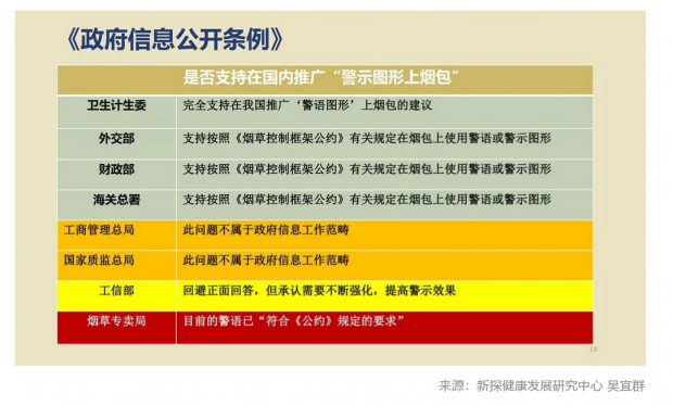 據中華預防醫學會傷害預防與控制分委會副主委,新探健康發展研究中心副主任吳宜羣9月27日在“‘健康是我的權利’控煙公益工作坊”中的報告,曾有律師向中國八部委關於“是否支持在國內推廣警示圖形上煙包”提出信息公開,得到了幾種不同答案: