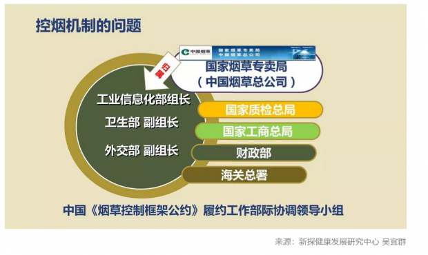 負責賣煙的國家煙草專賣局不願意減少收入沒有什麼稀奇的。稀奇的是,負責履行《煙草控制框架公約》的協調小組中,組長由工信部部長擔任,而(原)國家衞計委主任擔任副組長。國家煙草專賣局歸屬工信部——這意味着,在控煙這件事上,賣煙的人比管理公共健康的人有更大的權力。