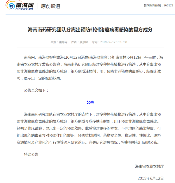 當天15時16分,南海網發佈題為《海南成功研製出預防非洲豬瘟病毒注射劑》的報道,“6月12日下午三時,海南省農業農村廳發佈公告稱,海南南藥研究團隊經對多種熱帶植物進行篩選,從中分離出預防非洲豬瘟病毒感染的複方成分,組方製成注射劑,用於預防非洲豬瘟病毒感染,經臨牀試驗,顯示出一定的預防效果。”上述報道同時附上了署名為海南省農業農村廳的公告原文。