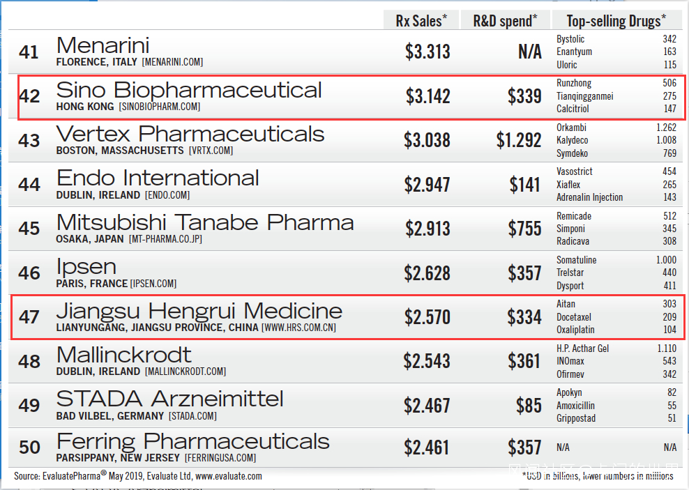 今年,有2家中國企業首次上榜:中國生物製藥和恆瑞醫藥,分別名列榜單第42位和47位。