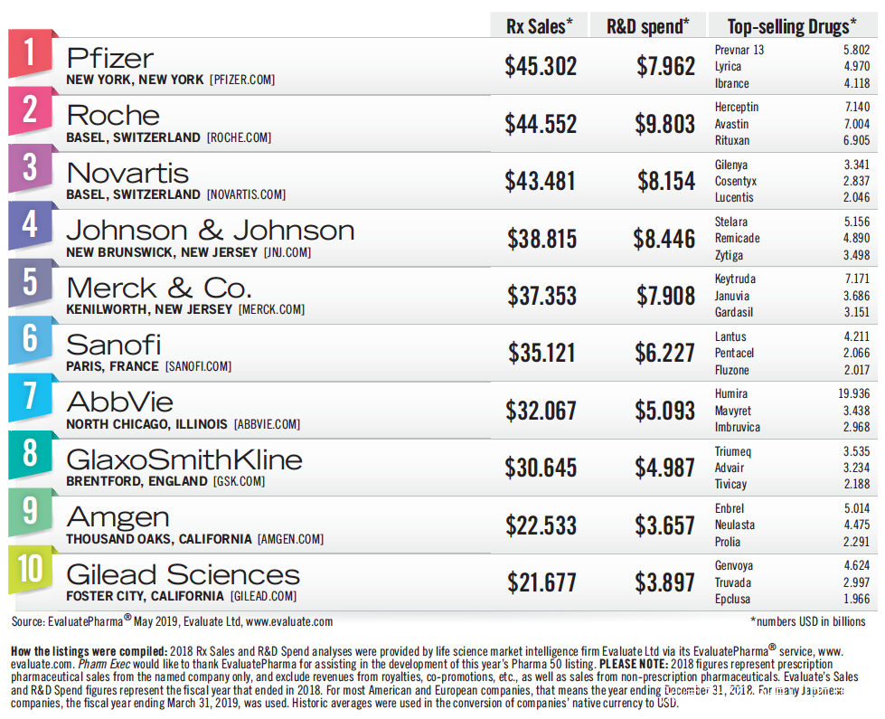 與2018年的榜單相比,2019年的TOP10藥企中除了輝瑞(PFE.US)保住了第1名,GSK保住了第8名之外,排名有比較大的變化。