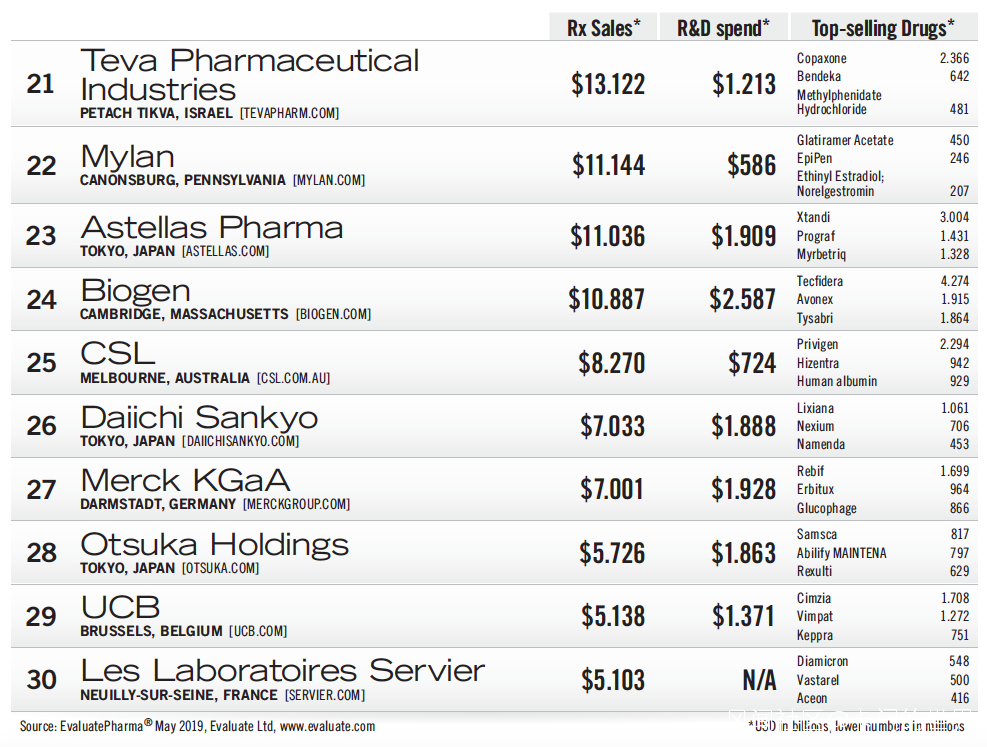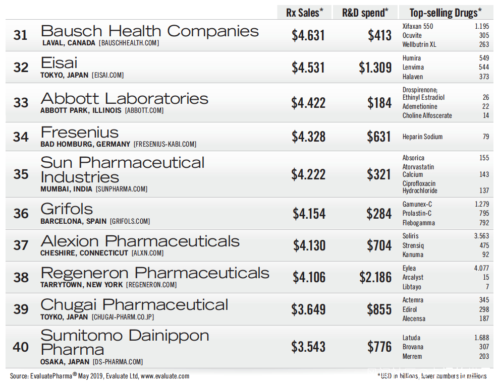 Gilead由於丙肝藥物市場萎縮,排名跌落到第10名,並且與第11名的銷售額相差不到1億美元。