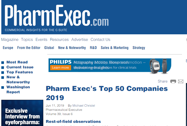 美國時間6月11日,Pharm Exec(美國製藥經理人雜誌)公佈2019年全球生物製藥企業Top 50榜單,該排名的主要依據是各企業2018年處方藥銷售額。輝瑞公司再度位居榜首,兩家中國企業中國生物製藥、恆瑞醫藥首次登上該榜單。