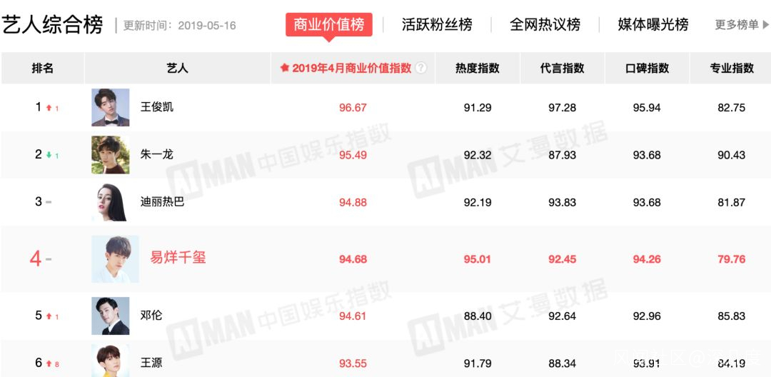 2019年1月艾漫數據藝人商業價值榜中易烊千璽居於亞軍,並在中國文娛金數據2018年度優秀代言效果男藝人中名列第六。AdMaster2018CSI最具商業價值明星榜單問鼎榜首。