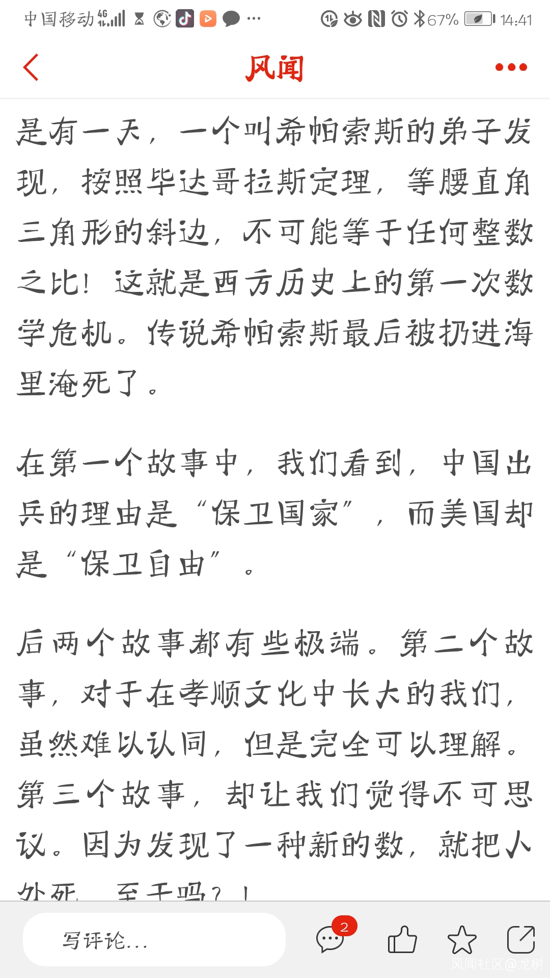第三個故事其實講得是不同文明對不同理念的重視程度區別而已。比如中國就很重視史料記述,史官可以為了反抗不實記錄而去死,所以中國史料記錄舉世無雙,否則我們怎麼宣稱自己是唯一文明從未中斷的?但中國人在科技發展中就是沒有發現科學形式邏輯,但世界上那麼多文明,也只有希臘發現了而已。只能説中國在科技上走了另外一條效率不高的路而已。結論只能説我們並不完美,也要虛心學習。當然從兩種文明起源來説,農耕文明過於務實,所以中國人發明了許多實用科技,對於形式邏輯證明這些看上去不實用的知識不重視。而遊牧文明,象希臘這種倚靠奴隸生產,貴族公民有大量時間去思考不實用但複雜有趣的邏輯證明也是個原因!