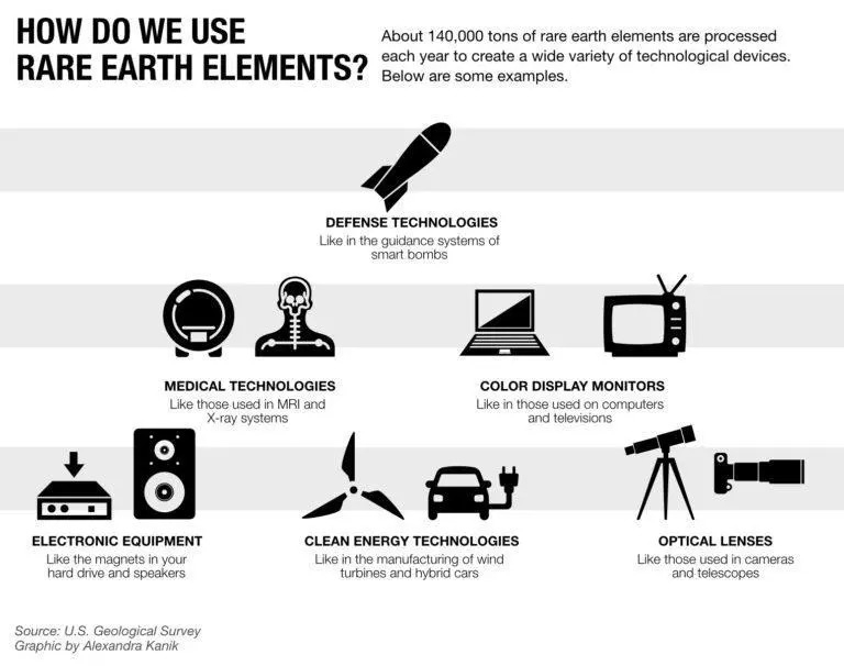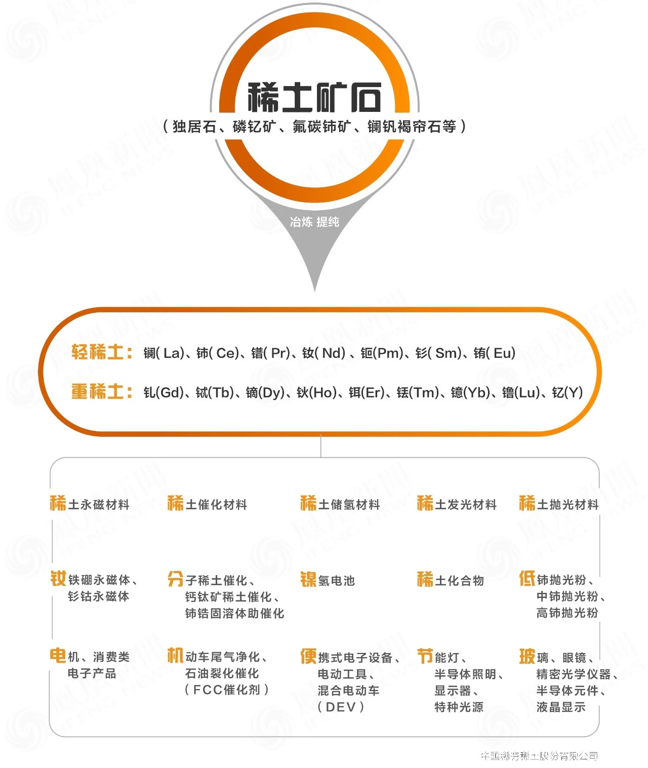 稀土在製造業中用途十分廣泛,既用於生產智能手機等消費類電子產品,也被用於電動風力渦輪機、電動汽車,醫用掃描儀等工業類產品,甚至連製造噴氣式飛機發動機、衞星和激光設備等軍事設備也必不可少。根據礦物特質差異,稀土被分為輕稀土和重稀土兩類,其中重稀土更具戰略價值,因為大部分軍事設備都需要重稀土元素。