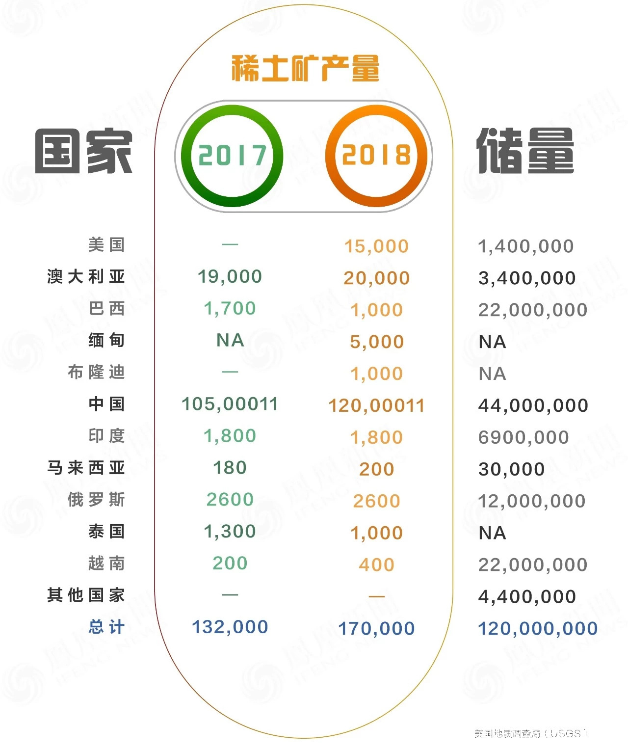 根據美國地質調查局(USGS)發佈的稀土資源報告,截止2018 年全球共有稀土儲量1.2 億噸,中國有4400萬噸,佔比38%,美國佔比約1%;全球中重稀土資源分佈中,中國佔比41%,美國佔比22%。除去中美,全球尚有近三十個國家地區擁有稀土資源。2018年,全球稀土礦產品產量約19.5萬噸,中國產量為12萬噸,佔62%;