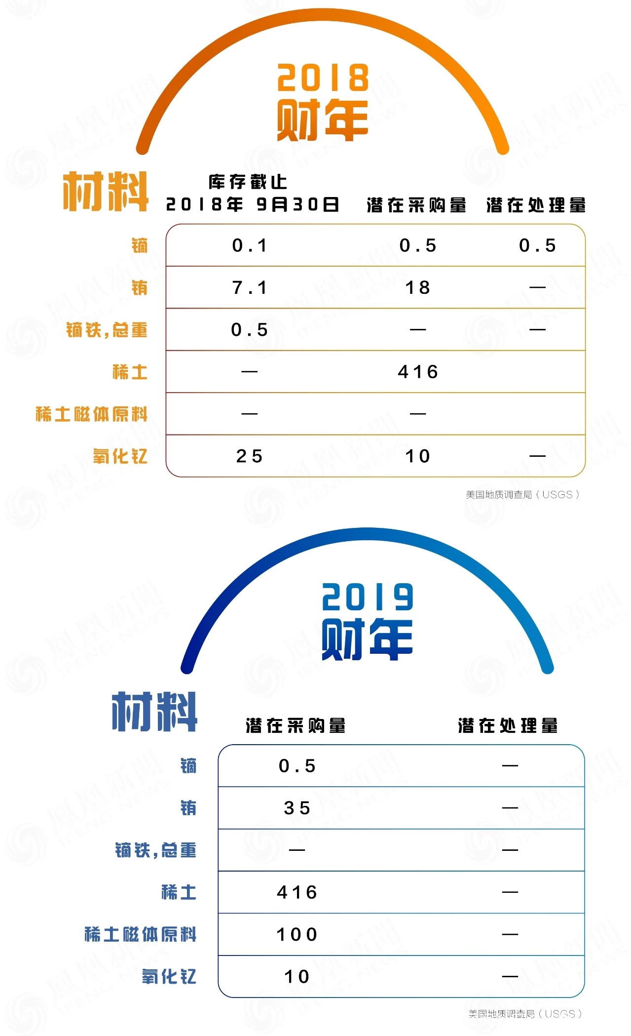 從2016-2018年美國政府庫存數據上看,美國在此期間儲備了0.5噸鏑、18噸銪和25噸氧化釔,以中重稀土元素為主,此外,在2018年計劃採購的稀土元素清單裏,有416噸未具體説明是何種稀土產品,可以看出美國在2018年中美摩擦期間已儲備了總計超400噸中重稀土元素產品。