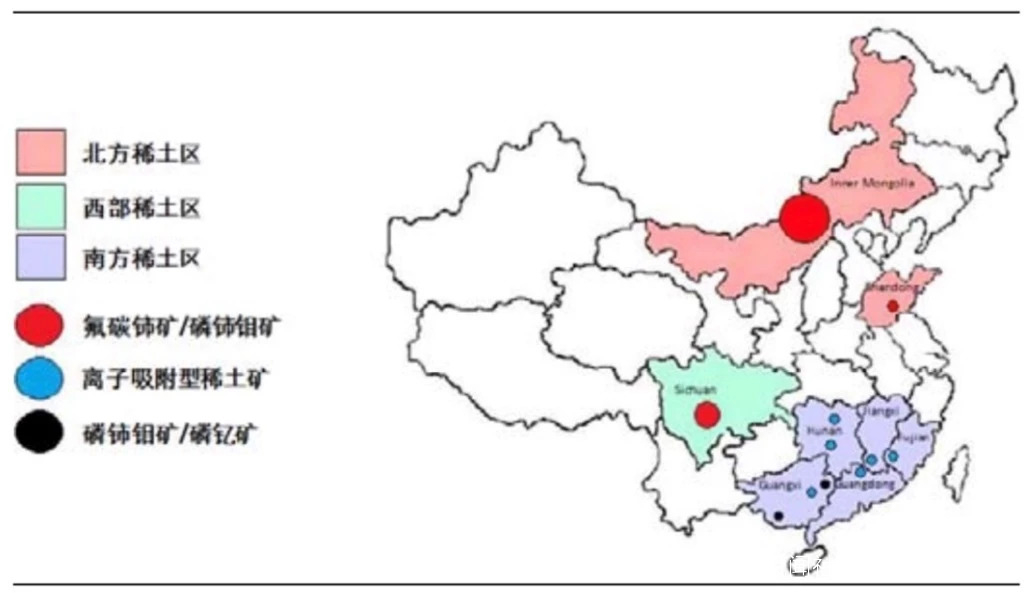 中國稀土資源總量的98%分佈在內蒙、江西、廣東、四川、山東等地區,形成北、南、東、西的分佈格局,具有北輕南重的分佈特點。輕稀土型資源主要分佈在內蒙古地區。重稀土型資源則主要分佈在中國南方地區,例如江西、廣東、廣西。