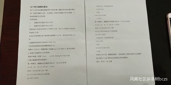 為了證明自己在事故中無責,孫先生拿出了令人驚訝地拿出了自己運用了物理知識作出的推算證據,以此來證明自己的清白。記者看到孫先生的推算紙張上,把碰撞分為兩樓情況,用公式一一演算,並得出結論,是對方車輛的全責。而這一推算證據,把警察叔叔給看“懵”了。