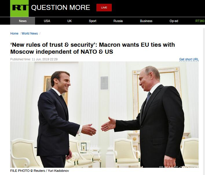 【環球網報道 記者 李東堯】當地時間6月11日,法國總統馬克龍在接受採訪時表示,歐洲應該擺脱北約的限制,獨立地重建與俄羅斯的關係。他還提醒歐洲不要忘記蘇聯在二戰中付出的代價。此前,馬克龍曾因未邀請俄羅斯總統普京出席諾曼底登陸75週年紀念活動而受到法國反對派的批評。