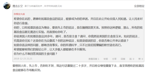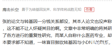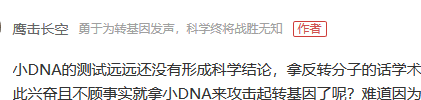 這位網友指出,原來,挺轉貨色叫囂轉基因,就是為了錢。為了錢,在沒有完成安全性評估的情況下,就種植轉基因。並且沒有基本生物學知識,造謠世界上不存在的“小DNA”.這就是挺轉的本質。