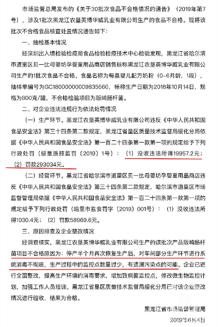 6月4日,黑龍江省市場監督管理局發佈通告,對生產不合格奶粉的黑龍江農墾英博華威乳業有限公司(以下簡稱華威乳業)開出罰單:沒收違法所得19.9萬元、罰款29萬元。今年3月7日,國家市場監督管理總局公佈《關於30批次食品不合格情況的通告》,由華威乳業生產的每嘉嬰兒配方奶粉“榜上有名”——奶粉中檢驗出有致死率極高的阪崎腸桿菌,事後該乳業公司被勒令停產至今。