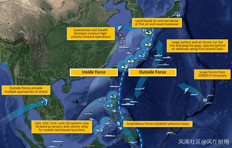 美智庫CSBA稱,該戰略符合和平時期大國競爭的思路,目的是建立前沿縱深防禦體系,美國退出中導條約為該戰略的實施提供了有利條件,主要做法是內防外壓(Inside-Out Defense)。內防部分,可以在第一島鏈上部署M142高機動火箭炮或岸艦導彈、中近程防空系統、雷達、電子戰分隊、機動步兵連、後勤保障分隊等,外壓部分指的是美國海空軍穿透防禦體系打擊中國本土以及海上貿易航線。