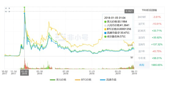 非小號行情顯示,從2017年12月5日的0.014元,到2017年12月24日的0.33元,僅20天時間,波場幣暴漲23倍。這時候波場的流通市值高達200多億元(31.88億美元)。隨着加密貨幣市場的温度不斷上升,再加上極高的控盤比例,在2017年12月20日~2018年1月1日橫盤了10天之後,波場幣開始衝擊百倍。