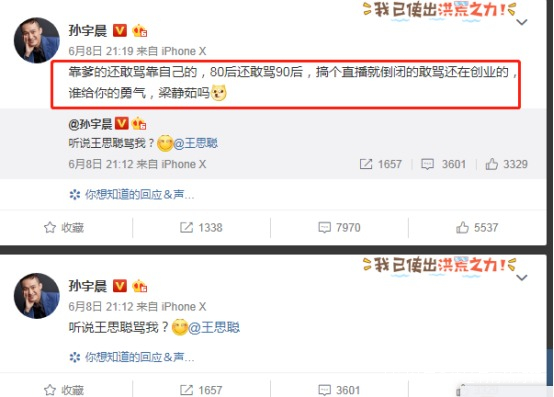 一石激起千層浪。這還不算結束,面對來自各方“騙子”的質疑,孫宇晨反擊“王小川是打工的”,又炮轟王思聰,“靠爹的還敢罵靠自己的,80後還敢罵90後,搞個直播就倒閉的敢罵還在創業的,誰給你的勇氣”。