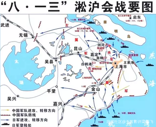 這是淞滬抗戰示意圖。日軍在金山衞登錄之前主要是從吳淞口登陸,然後往西打,戰鬥主要發生在嘉定、寶山、楊浦這一帶。國軍打得非常英勇,但戰術又非常死板,只知道和日軍正面硬碰硬,結果火力又不如對手,所以最終國軍損失巨大,不得不撤出上海。