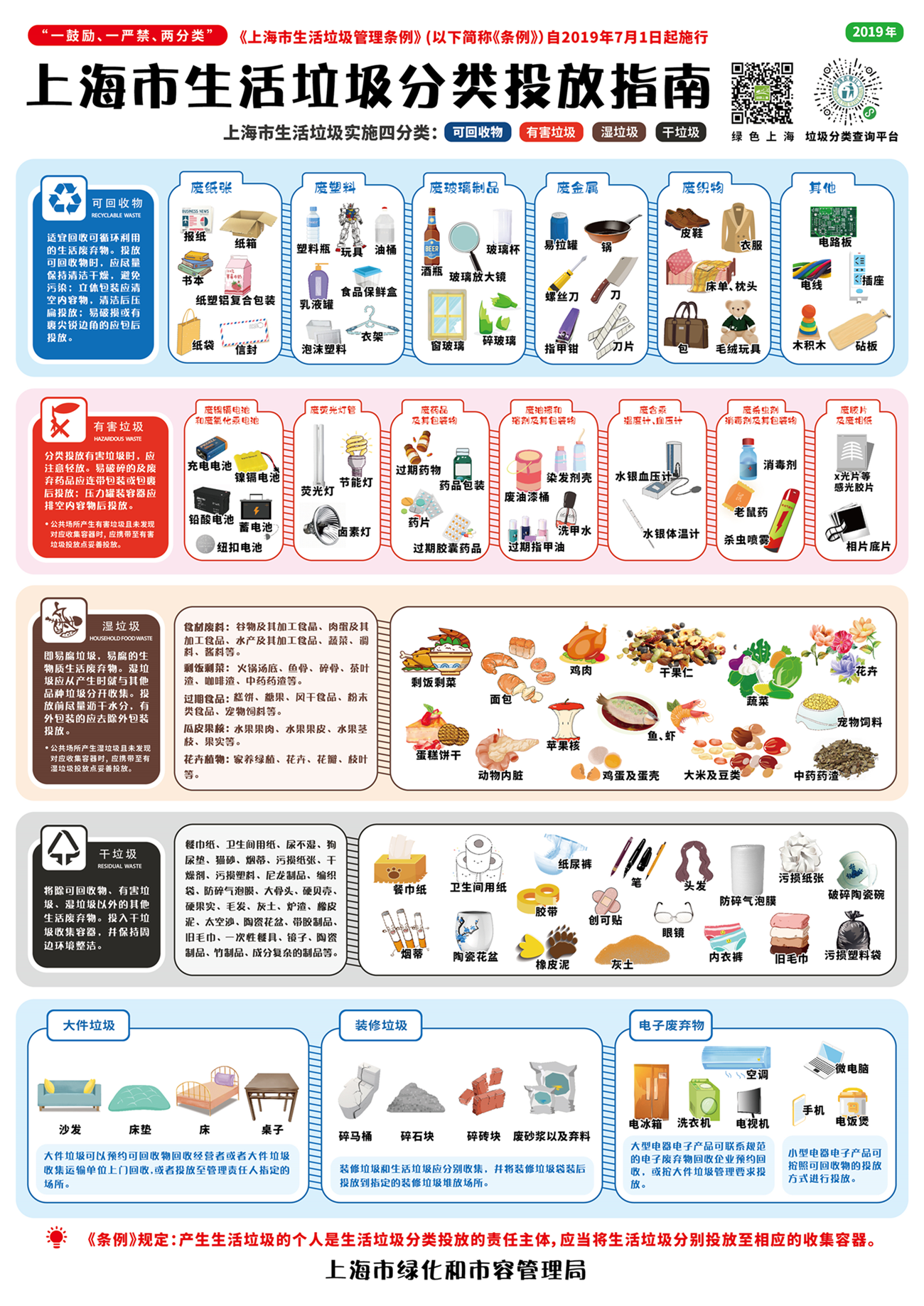 6月12日,上海市綠化市容局發佈了《上海市生活垃圾分類投放指南》,圖文並茂,將主要的可回收物、有害垃圾、濕垃圾、幹垃圾,還有大件垃圾、裝修垃圾、電子廢棄物等“一網打盡”。