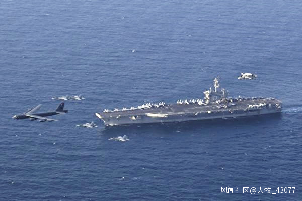 2019年6月1日,美軍的林肯號航空打擊羣與B-52轟炸機,在阿拉伯海舉行聯合演習(圖源:Brian M. Wilbur/U.S. Navy)