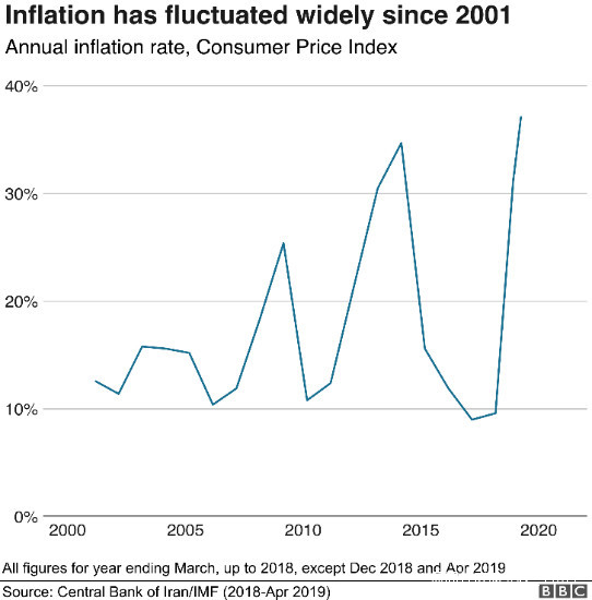 伊朗通貨膨脹率直線上升,如今已突破30%,預計2020年會接近40%(圖源:BBC)