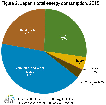 日本總體能源消耗中,石油和其他液體佔比最高,達42%(圖源:美國能源信息署)