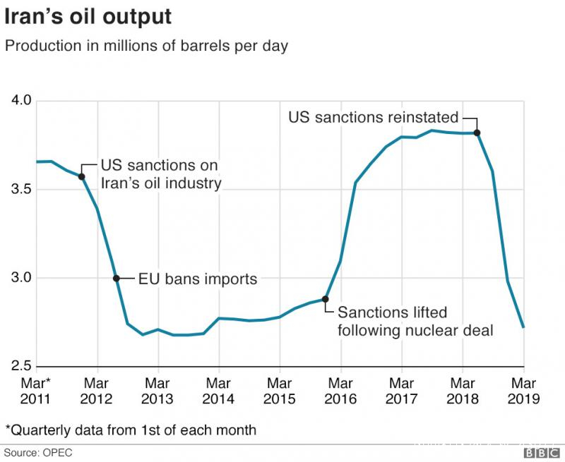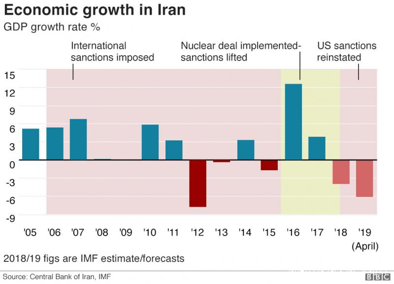 美國2018年重啓對伊朗制裁後,伊朗GDP增長率直線下跌(圖源:BBC)