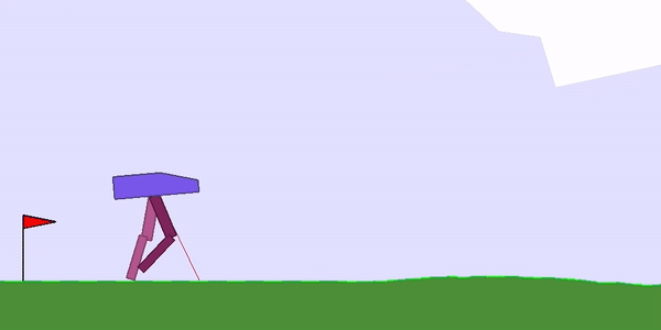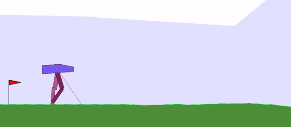 一隻兩足“生物”,要在隨機生成的道路上往前走,越過凸起,跨過陷坑。獎勵多少,就看它從出發到掛掉走了多長的路,以及電機扭矩的成本 (為了鼓勵高效運動) 。