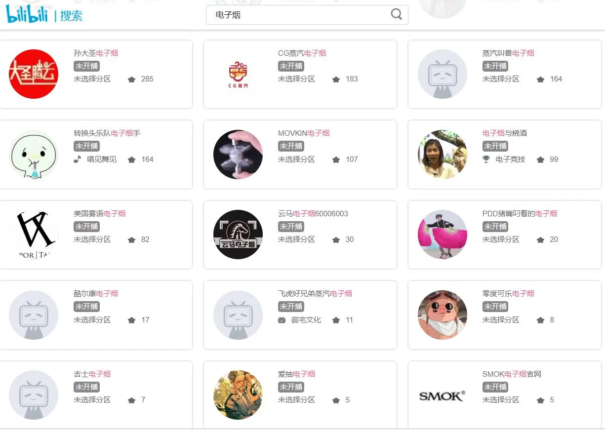 此外,在B站的直播頻道,同樣存在大量以電子煙為名的主播,其中關注人數最多的達5400人。