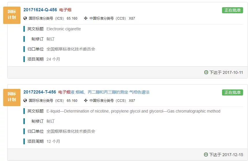 在電子煙產品的監管方面,國內目前也還缺乏明確的規定。中國搜索發現,目前有兩項電子煙國家標準已於2017年在國家標準化管理委員會立項,不過均處於“正在批准”狀態,尚未發佈。