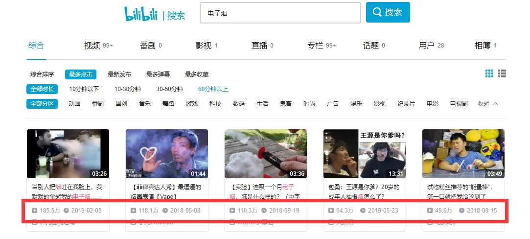 而這樣一個年輕人高度集中的社區,自然也成了標榜潮流的電子煙滲透的目標。中國搜索發現,在B站以電子煙為關鍵詞搜索,結果高達50頁,視頻數量約為5000條,其中點擊量最高的近186萬。