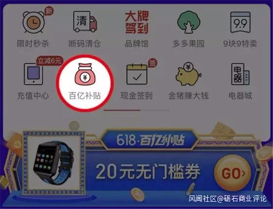 2019年6月1日,拼多多宣佈全面啓動618大促,將聯合品牌商共同投入驚人的100億現金補貼,加入2019年的618電商大戰。100億現金補貼,拼多多投入了不輸於京東、天貓等20000億交易規模巨頭的資源進行飽和攻擊,以截胡過去主要由京東、天貓壟斷的中產階級與白領用户。