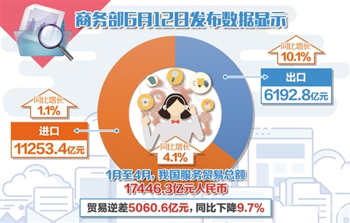 經濟日報北京6月12日訊 商務部12日發佈的數據顯示,今年1月份至4月份,我國服務貿易總額17446.3億元,同比增長4.1%。其中,出口6192.8億元,增長10.1%;進口11253.4億元,增長1.1%;逆差5060.6億元,下降9.7%。