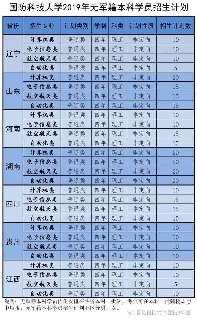 經教育部和軍委機關批准,國防科技大學2019年在遼寧、山東、河南、湖南、四川、貴州和江西等7省份招收無軍籍本科學員360人。學校無軍籍本科學員招生安排在各省本科一批次,考生可在本科一批院校志願中填報。無軍籍本科學員招生計劃不區分男、女,具體如下: