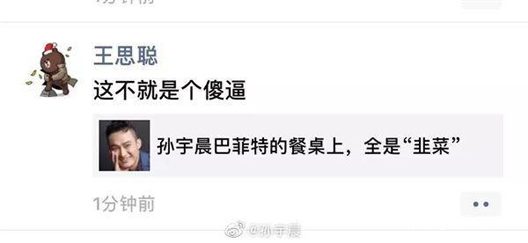 在孫宇晨拍下與巴菲特午餐後,麥傑遜寫了篇《孫宇晨與巴菲特的餐桌上,全是“韭菜”》,引起轟動,刷爆朋友圈。王思聰在朋友圈轉了這篇文章,並直截了當地評論道:這不就是個傻逼!