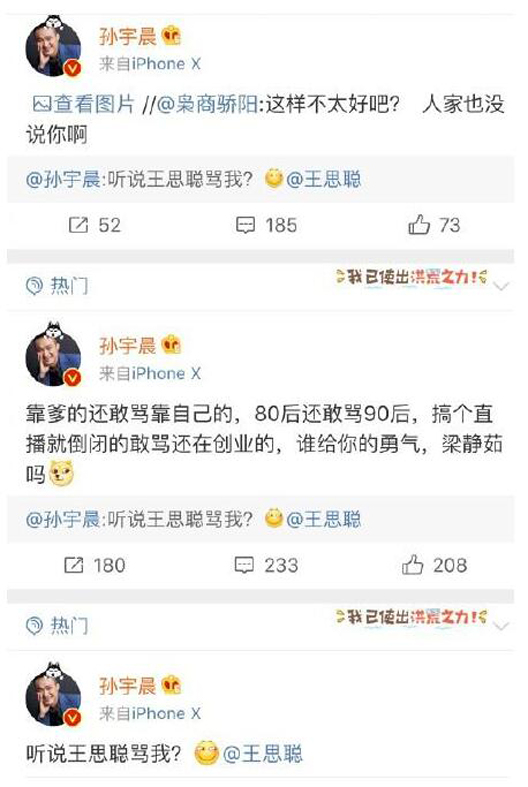 這徹底激怒了這個90後網絡代表人物。孫宇晨拍案而起,一口氣連發數個微博,句句點穴王思聰痛處。6月8日晚間,孫宇晨在微博上怒懟:靠爹的還敢罵靠自己的,80後還敢罵90後,搞個直播就倒閉的敢罵還在創業的,誰給你的勇氣,梁靜茹嗎?